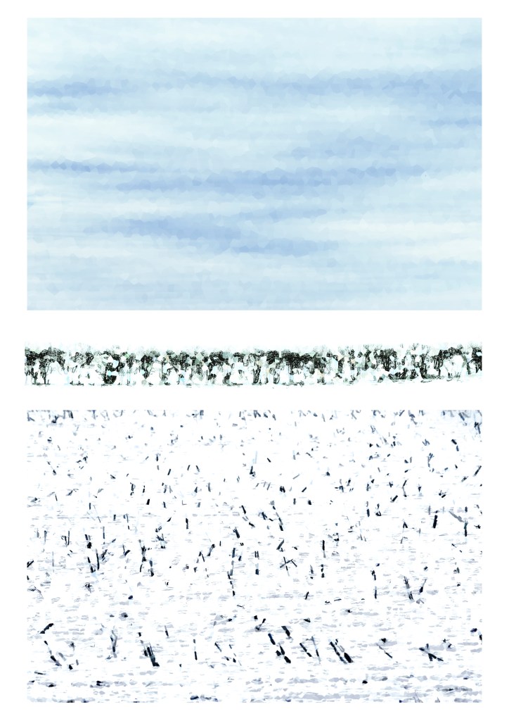Seeking to photograph this landscape in a fresh, creative way, an attempt to describe what I see and feel, led me to this work. I decided to photograph foreground, middle ground and sky and then assemble into a vertical triptych. I further sought to reduce the detail to colour and pattern and there were several influences for this. The Impressionists, Paul Cézanne’s Mount Sainte-Victoire view from Louvres (1904), and the almost pixilated brushwork effect created by Paul Signac in Capo di Noli (1898) were a start. George Seurat the creator of Pointillism, La Seine à la Grande-Jatte (1888) and Bridgit Riley’s homage to Seurat, Pink Landscape (1960), are all influences although the work is perhaps more object, rather than colour, separation. The prints, much like impressionism look different when viewed closely, or from a distance. I am also drawn to the work of Mark Rothko and other colour field artists of the Abstract Expressionist period including Ad Reinhardt, Josef Albers and Hans Hofmann. I did discover the work of another artist, after I started this work, Brice Marden. Marden’s ‘For Pearl’ (1970), a vertical triptych of blocks of colours representing the south of France. Originally called ‘A Mediterranean Painting’ Marden changed the name following the death of Janis Joplin.